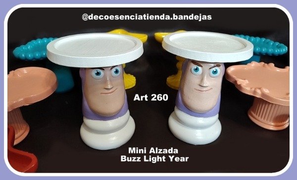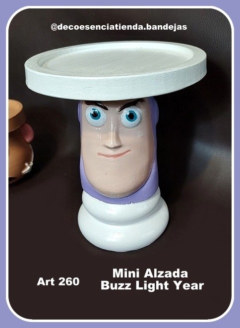 El art 260 es una Mini Alzada con la figura de Buzz Light Year que esta elevado sobre un pedestal y sostiene sobre su cabeza un platito circular de 15 cm de diametro para colocar pasteleria.
